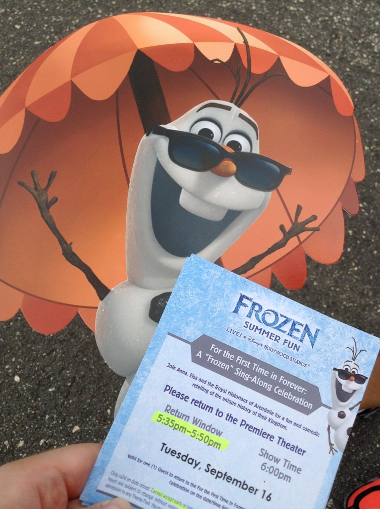 IMG_0165 Published September 16, 2014 at 1702 × 2280 in Day 2- Hollywood Studios Olaf and our Ticket!