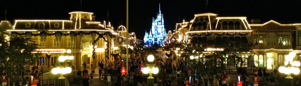 After we got pictures with the legendary Weinermobile, we were off to catch the Monorail to Magic Kingdom. As we get into the Main Street USA area, we see that A Frozen Holiday Wish is going on, and Elsa is just about to light the castle. We run up to the top level of the Train Depot and just in time to watch from the balcony! It is beautiful!
